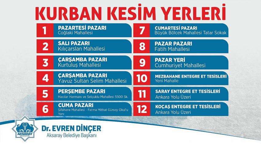 Aksaray Belediyesi kurban bayramında vatandaşların hijyenik ortamlarda sorunsuz bir şekilde kurban ibadetlerini yerine getirmeleri için yer belirlemelerini yaparak hazırlıklara başladı.  Aksaray Belediyesi, vatandaşların daha temiz ve sağlıklı koşullarda Kurban ibadetini yerine getirmesi için gerekli önlemleri aldı. Belediye tarafından 12 farklı nokta kurban kesim alanı olarak belirlendi. Kurban satışları Aksaray Ticaret Borsası yanı modern hayvan pazarında yapılıyor. Kurban satış noktasında kurbanlık hayvanların belge ve sağlık kontrolleri veteriner hekimler tarafından kontrol edilecek. Ayrıca kurban satış ve kesim noktalarında yaşanacak olası trafik yoğunluğunu önlemek için belediye ulaşım hizmetleri müdürlüğü ekiplerince bir dizi tedbirler alındı. Aksaray Belediyesi, vatandaşların kurban ibadetlerini yerine getirirken işlerini kolaylaştırmak için Kurban kesim noktalarına caraskal kuracak. Temizlik ekipleri, bayram boyunca kurban kesim alanlarında oluşan atıkları sık sık temizleyecek.  Belirlenen Kurban Kesim Yerleri: Yeni Mahalle - Aksaray Ticaret Borsası Mezbahanesi Fatih Mahallesi – Pazar Pazarı alanı Büyük Bölcek Mahallesi – Cumartesi Pazar alanı Kurtuluş Mahallesi – Çarşamba Pazar alanı Coğlaki Mahallesi – Pazartesi Pazar alanı Hacılar Harmanı ve Selçuklu Mahallesi –Perşembe Pazar alanı Cumhuriyet Mahallesi – Çarşamba Pazar alanı Yavuz Sultan Selim Mahallesi- Çarşamba Pazar alanı Kılıçarslan Mahallesi - Salı Pazar alanı Şifahane Mahallesi – Cuma Pazar alanı Saray Entegre Et Tesisleri- Ankara Yolu üzeri Koçaş Entegre Et Tesisleri – Ankara Yolu Üzeri Belediye tarafından belirlenen kurban kesim yerleri dışında, park, cadde, sokak, meydan, yol gibi kamuya açık yerlerde kurban kesimi gerçekleştirenler hakkında yasal işlem başlatılacak. Firari kurbanlıklar için önlemler alındı Aksaray Belediyesi, her Kurban Bayramında olduğu gibi bu bayramda da sahibin elinden kaçan kurbanlıklar için önlemini aldı. Bayramda kaçan kurbanlar için belediyede ekipler hazır olarak bekleyecek. Kurbanlıklarını elinden kaçıran vatandaşlar Alo 153 veya (382) 213 54 92 no’lu telefon hattında yardım isteyebilecek. Sosyal belediyecilik anlayışı ile çalışmalar yürüten Aksaray Belediyesi Yeni Mahallede bulunan Aksaray Ticaret Borsası Mezbahanesinde çadır kurarak vatandaşlara kavurma ikramında bulunacak.