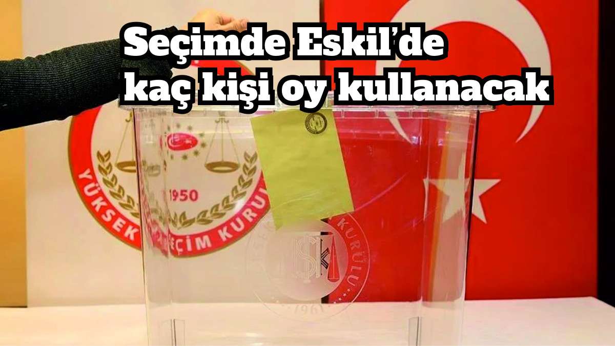 2024 seçimlerinde Eskil’de Belediye başkanlığı için 12 bin 998 kişi oy kullanacak. Bu oyların 4 bin 862 Eskil merkezden olurken, 8 bin 136 sı diğer mahallerde kullanacak. İl Genel meclis üyeliği için toplam 19bin558 oy sandığa gidecek. Eşmekaya kasabasında 1926 seçmen oy kullanacak. Eskil’de geçmiş seçim dönemlerinde ortalama yüzde 90’a yakını sandığa gitmiş
