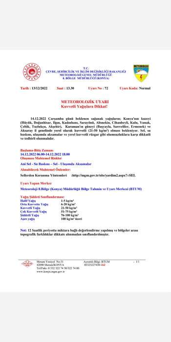 14.12.2022 Çarşamba günü beklenen sağanak yağışların; Konya'nın kuzeyi (Hüyük, Doğanhisar, Ilgın, Kadınhanı, Sarayönü, Altınekin, Cihanbeyli, Kulu, Yunak, Çeltik, Tuzlukçu, Akşehir), Karaman'ın güneyi (Başyayla, Sarıveliler, Ermenek) ve Aksaray il genelinde yerel olarak kuvvetli (21-50 kg/m²) olması bekleniyor. Sel, su baskını, ulaşımda aksamalar ve yerel kuvvetli rüzgar gibi olumsuzluklara karşı dikkatli ve tedbirli olunmalıdır. Başlama-Bitiş Zamanı 14.12.2022 06.00-14.12.2022 18.00 Oluşması Muhtemel Riskler Ani Sel - Su Baskını – Sel - Ulaşımda Aksamalar Alınabilecek Muhtemel Önlemler: Sellerden Korunma Yöntemleri :http://mgm.gov.tr/site/yardim2.aspx?=SEL Uyarı Yapan Merkez Meteoroloji 8.Bölge (Konya) Müdürlüğü Bölge Tahmin ve Uyarı Merkezi (BTUM) Yağış Şiddeti Sınıflandırması: Hafif Yağış 1-5 kg/m² Orta Kuvvette Yağış 6-20 kg/m² Kuvvetli Yağış 21-50 kg/m² Çok Kuvvetli Yağış 51-75 kg/m² Şiddetli Yağış 76-100 kg/m² Aşırı yağış 100 kg/m² üzeri Not: 12 Saatlik periyotta miktara bağlı değerlendirme yapılmış ve bölgeler arası topografik farklılıklar dikkate alınmadan sınıflandırılmıştır.